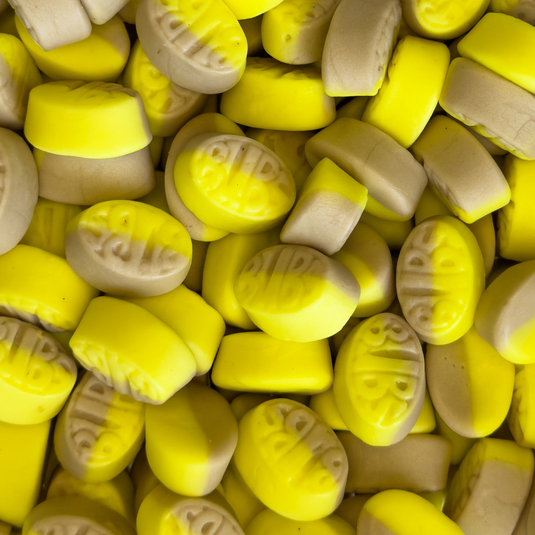 Totally bananas in mini format! Foamy banana-toffee ovals with a light, chewy texture and a bold, creamy caramel finish.