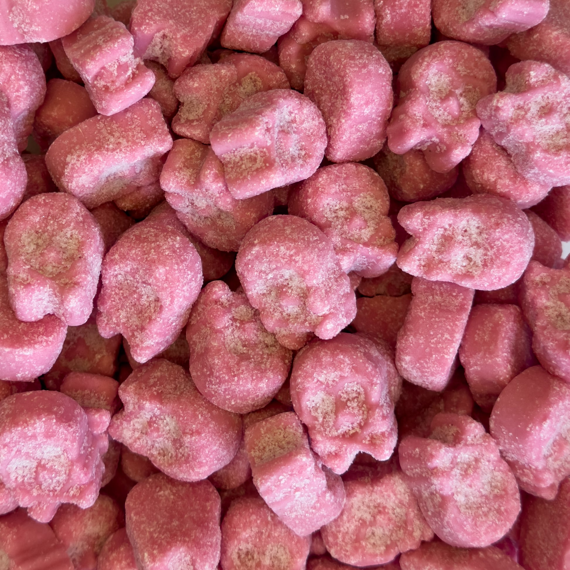 Cool raspberry mini foam skulls with a tangy twist. Legend has it, one took a dive into grandma’s raspberry punch and came out juicier, bolder, and just the right kind of sour. 100% vegan