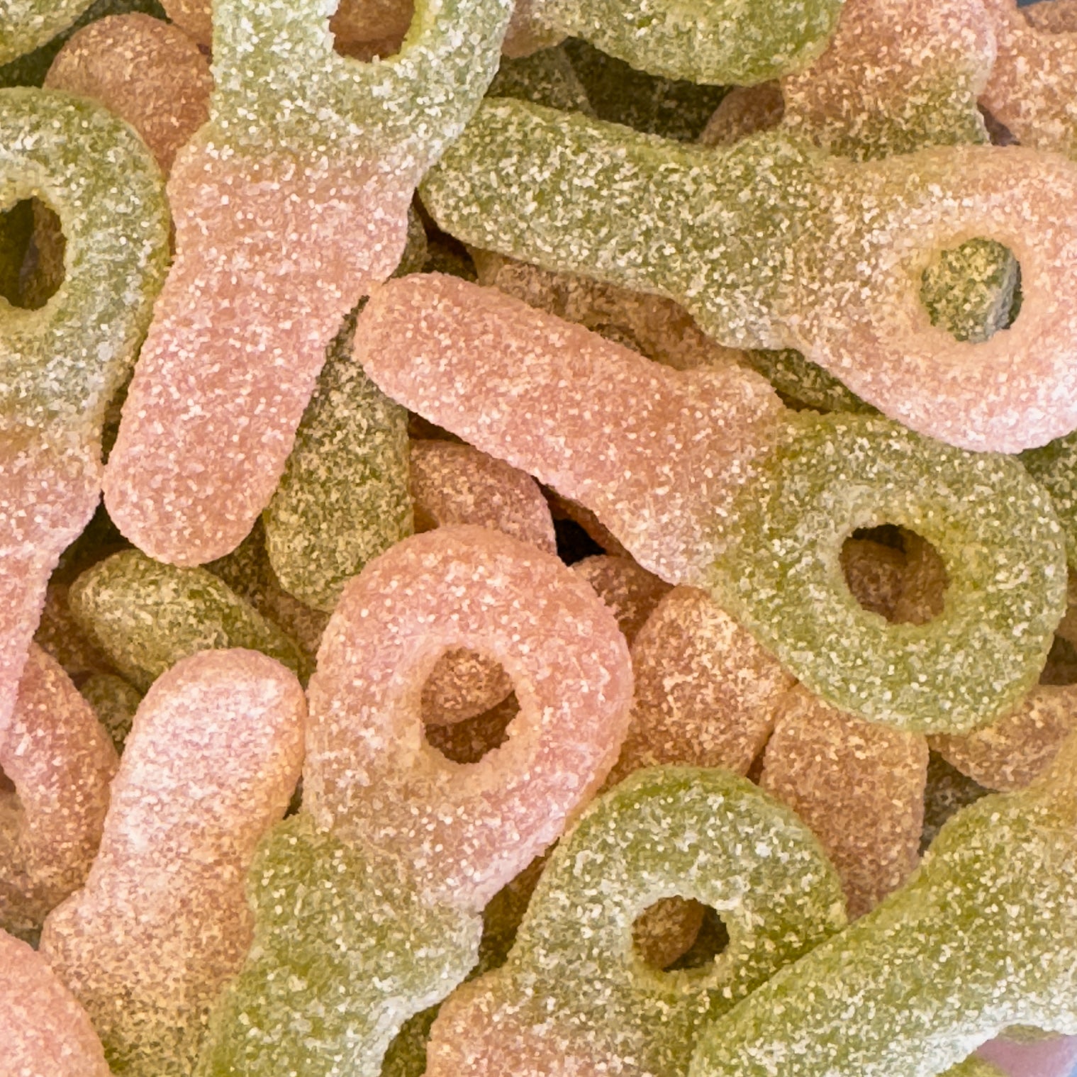 Shaped like tiny pacifiers and bursting with juicy watermelon flavour. Coated in fizzy sour sugar and coloured with plant-based dyes like spirulina and carrot, these green-and-pink bites are anything but childish. A playful shape, a bold sour hit, and a refreshingly fruity finish.